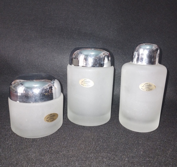 • KIT COM 03 PEÇAS PARA LAVABO - VIDRO FOSCO TAMPA EM METAL - MAIOR PEÇA MEDINDO 17 CM - SEM USO