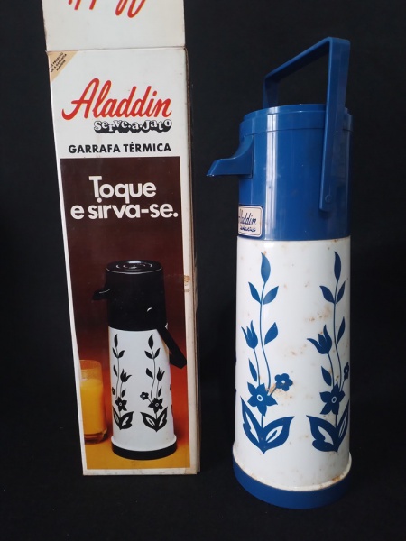 • ANTIGA GARRAFA TÉRMICA ALADDIN - SERVE A JATO - (SEM VIDRO INTERNO) - MEDIDAS CAIXA ORIGINAL 39 X 11 X 11 CM.