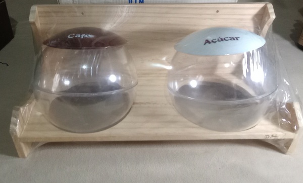 • CONJUNTO COM 02 RECIPIENTES EM ACRÍLICO PARA - CAFÉ E AÇÚCAR - BASE DE MADEIRA - CAIXA ORIGINAL MEDINDO 38 X 17 X 17 CM - SEM USO