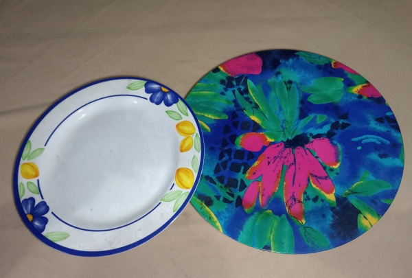 • LOTE COM 02 PRATOS - MELAMINA ESTAMPA FLORAL - MAIOR MEDINDO 37 CM - NO ESTADO