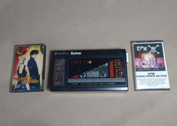 • LOTE CONTENDO 01 RÁDIO GRAVADOR K7 PORTÁTIL BEKASONIC - 02 FITASK7 DE ROCK - NO ESTADO - NO TESTADO